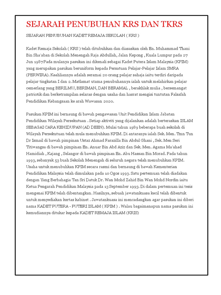 Sejarah Penubuhan Krs Dan Tkrs