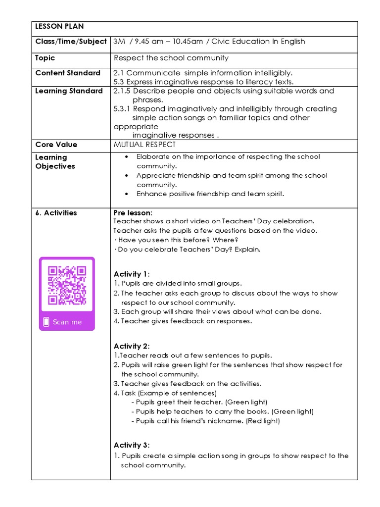 Lesson Plan Civic English Sk Year 6 English Language Teachers