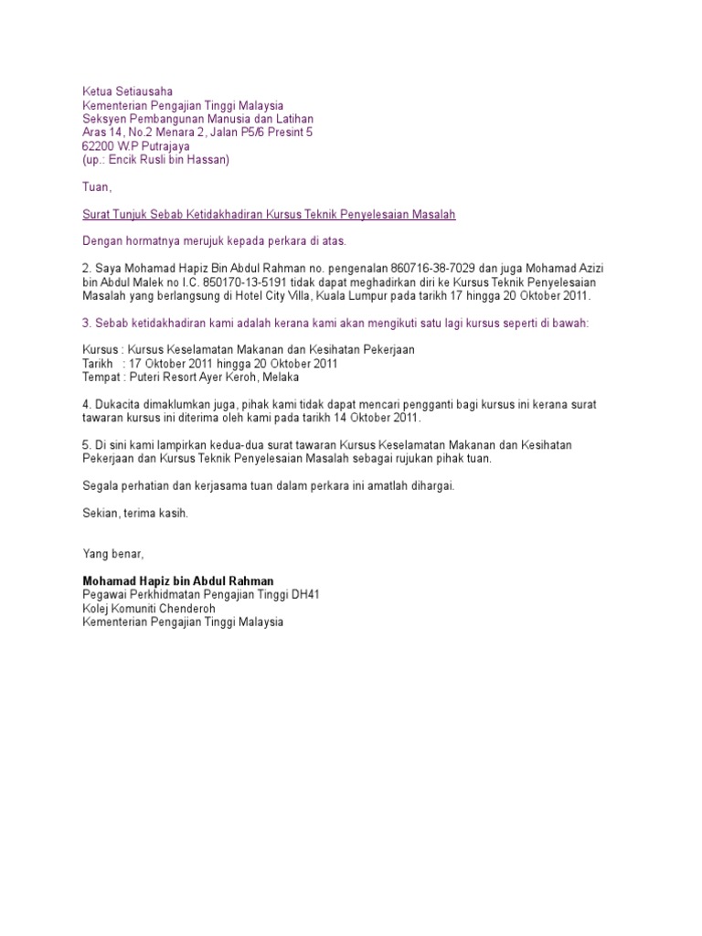 Contoh Surat Rasmi Tunjuk Sebab Tidak Hadir Kerja Rasmi Sua