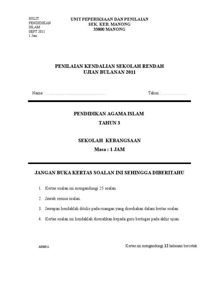 Muka Depan Kertas Peperiksaan Pendidikan Islam
