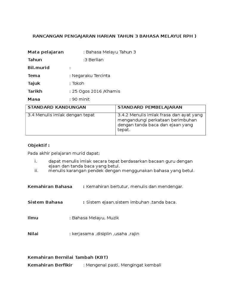 Contoh Penulisan Rph Bm Tahun 3 Kssr Semakan