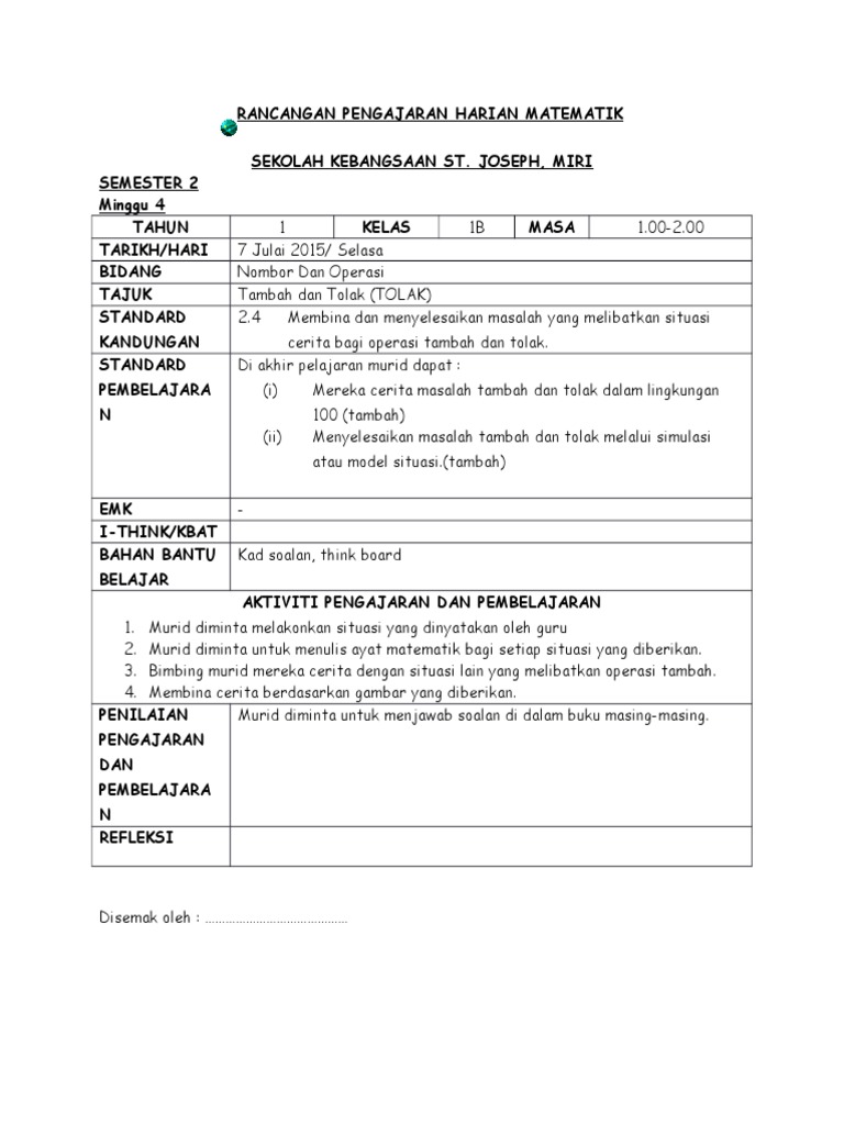Rancangan Pengajaran Harian Matematik 7 Jun