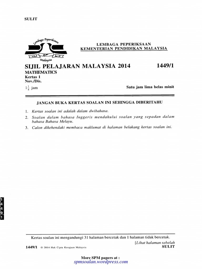 Spmsoalan Soalan Spm 2014 Matematik Kertas 1